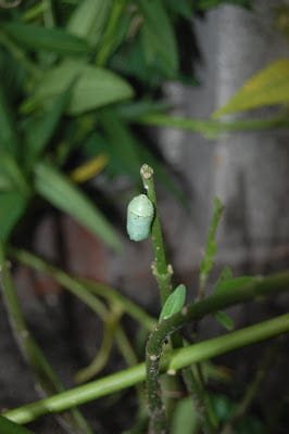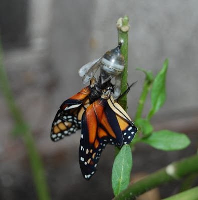 A Chrysalis! SM checked on it multiple times a day and I took a picture of it every morning. One day, SM came inside while I was eating breakfast and told me that it was no longer green, it had turned black. I went outside and was shocked to see it! I didn’t take a picture of it right then, but a little while later I went out with the camera and a butterfly was emerging!