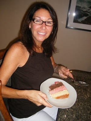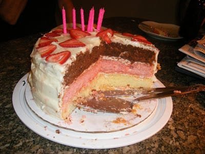 I finally found a picture of a cake that looked perfect! Unfortunately, it wasn’t a recipe, but one for sale… I figured could make the really cute neapolitan cake by using three cake recipes. I made vanilla, strawberry, and chocolate cakes and layered them together. It was DIVINE. So yummy!!!