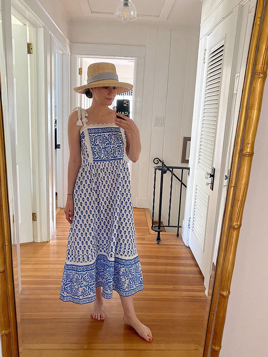 My exact dress is currently unavailable… this one is similar though. I bought it pre-pandemic for summer trips but I’m putting it to good use at home instead! Hat is from Peter Beaton!