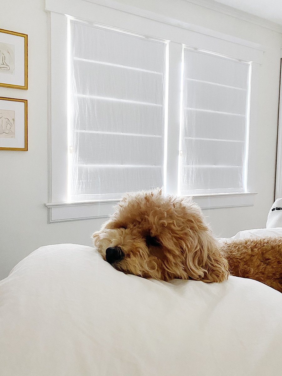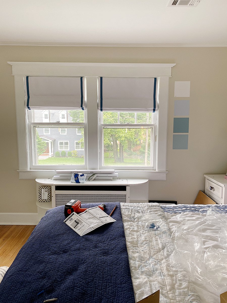 I bought these roman shades for our guest room. (You can work with the company to create your own color combination.) The guest room is finally, slowly but surely, getting a little bit of attention. Roman shades aren’t complicated to hang, but they always take more effort than I remember. It took two trips to Ace Hardware and a jammed finger for me to complete the task. I almost gave up… but the completed look was worth it!