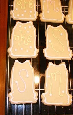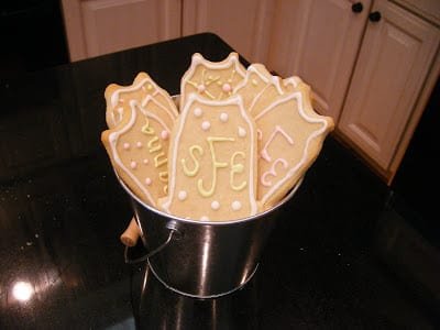 SM came up with the idea to make the girls cookies and it was just brilliant! I used royal frosting and piped their monograms and initials on a few and then adorable designs on the rest. Unfortunately, my memory card in my camera broke sometime last night 🙁 So these are the only pictures that came out.