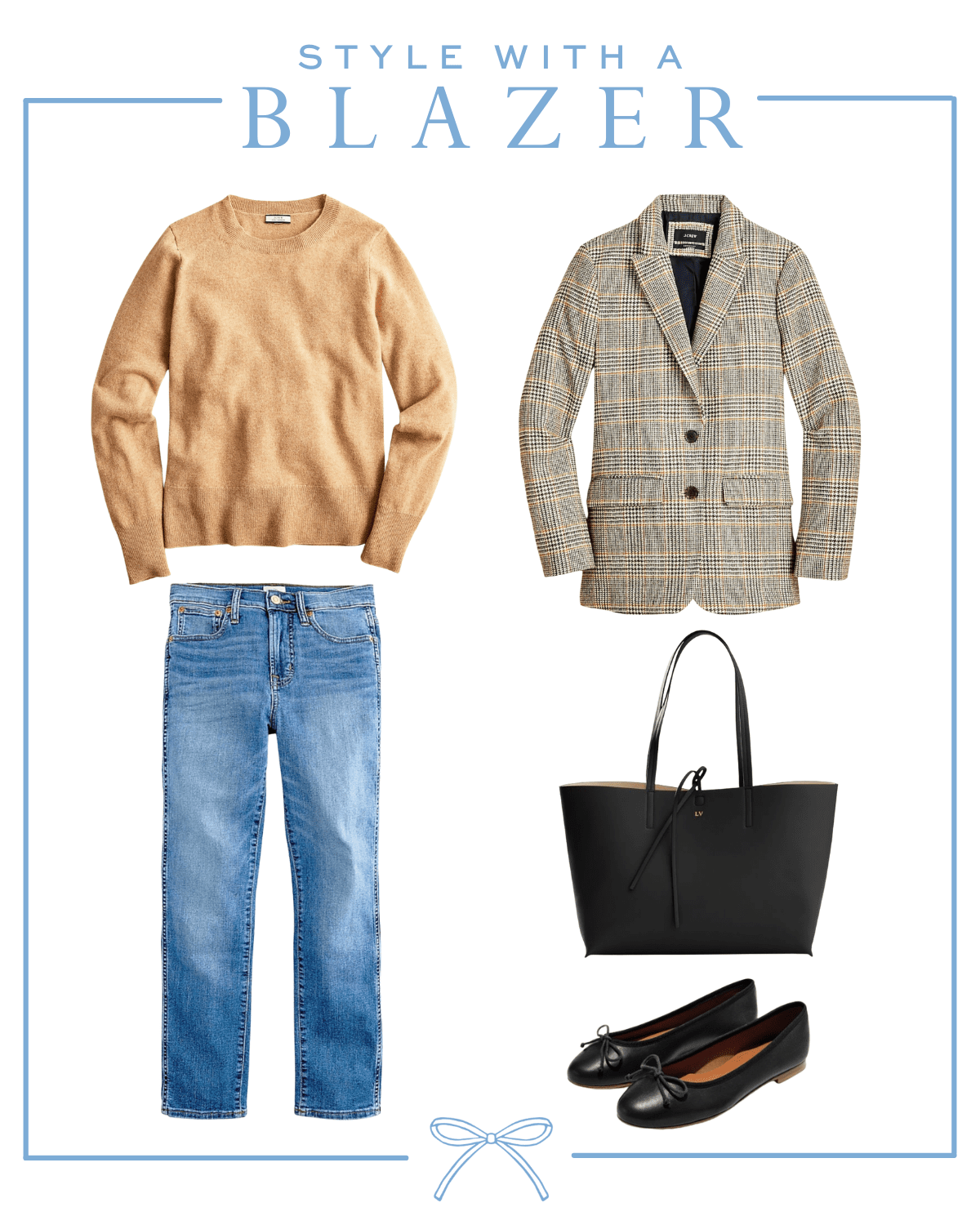 This is a super easy way to take your cozy cashmere sweater and slightly elevate it with a blazer and flats.