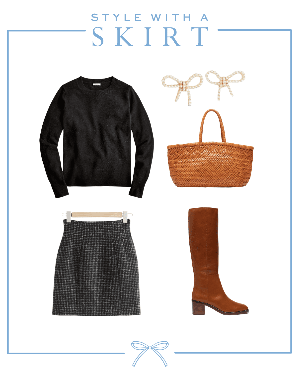 I’m all about wearing all black with tan accessories! Dress up a cashmere sweater with a wool skirt and tall boots.