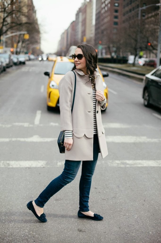 Original Post | Similar… Striped Shirt + Jeans + Flats + Scalloped Trench + Crossbody