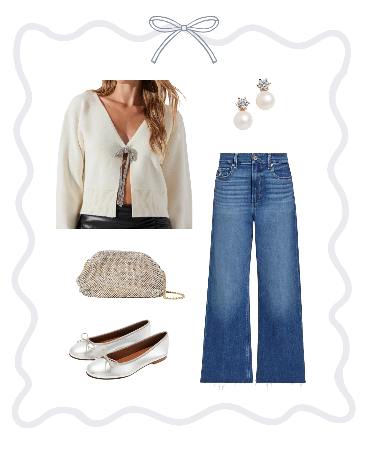 BOW CARDIGAN // BLACK CAMISOLE // PEARL EARRINGS // JEANS // CLUTCH // FLATS