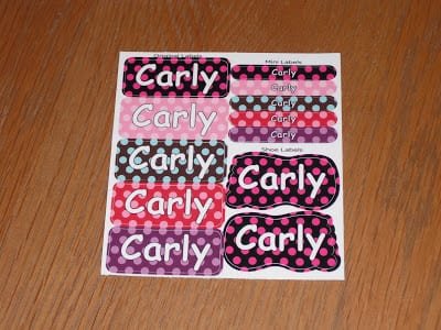 Here are the labels I received. I got the Polka Dot design. The ones on the left are the “Original Labels.” The labels in the upper right are “Mini Labels” and bottom right are “Shoe Labels.” You can customize yours with Last Names and Phone Numbers. (And the Found It System).