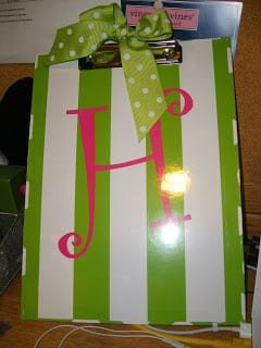 My roommate gave me this clipboard! Â (The H is for my last name!) Â She was very lucky and went to Florida for Easter break with her mom and sister. Â I was very very very jealous. Â I was even more jealous when she came back ĂĽber tan. Â How adorable is the clipboard though?